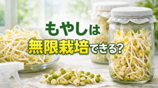 「もやしって水につけておけば、ずっと育てられるんじゃない?」そんなふうに思ったことはありませんか?結論からお伝えすると、もやしは完全な無限栽培はできません。ただし、仕組みを知っておくことで「なるほど、そういうことか」と納得できたり、無理なく...